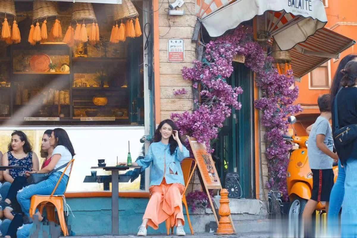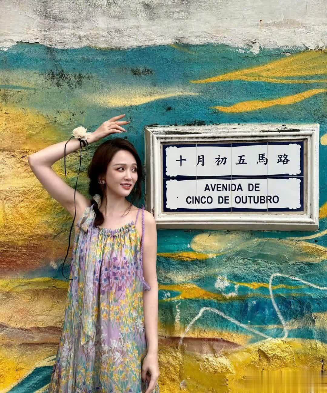 她的发型也很有少女感,侧编发上别着一朵小白花,瞬间增添了甜美的氛围,和背景色彩浓烈的涂鸦墙形成“柔与刚”的视觉对比,温柔又有记忆点。她站在墙前,笑容松弛又明媚,没有用力凹造型,却把度假的惬意感拉满。