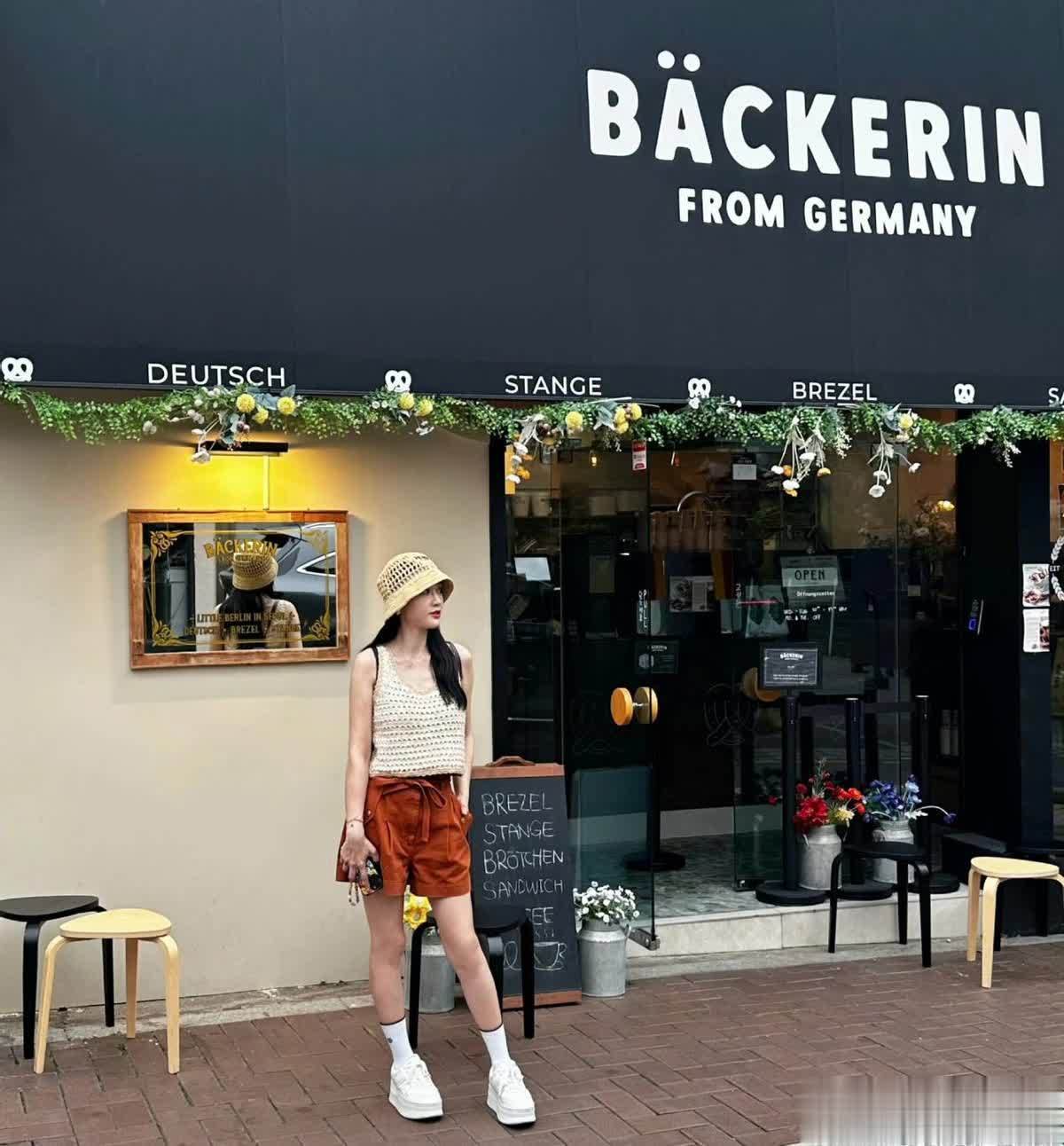 另一套在面包店门口的造型,则是轻复古与元气感的完美结合,非常适合春夏日常出街。上半身穿着米白色针织吊带背心,镂空的纹理自带透气感,露出纤细的肩颈线条,清爽又显身材,下装搭配焦糖色高腰短裤,利落的版型刚好卡在大腿中部,既显腿长又不会暴露身材短板,和白色吊带形成温柔的撞色。