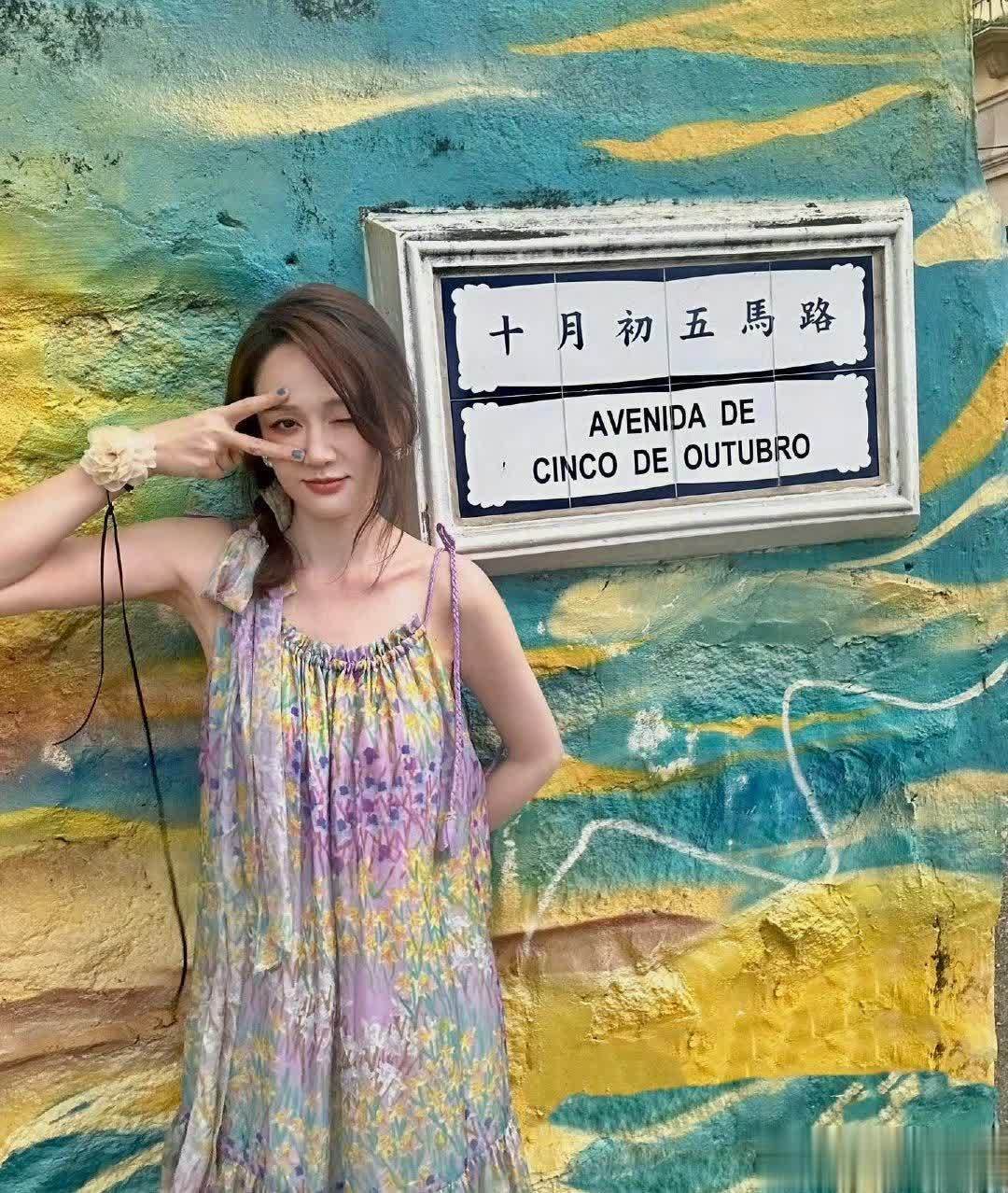 下面这一身搭配中,她更是把春日油画穿在了身上,一条印花吊带裙,浅紫、鹅黄、薄荷绿的晕染花纹像把花海穿在了身上,特别浪漫,轻薄的雪纺材质随风飘动,吊带和抽褶设计弱化了刻意感,显得随性又洒脱。